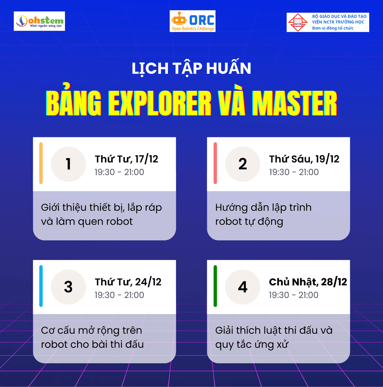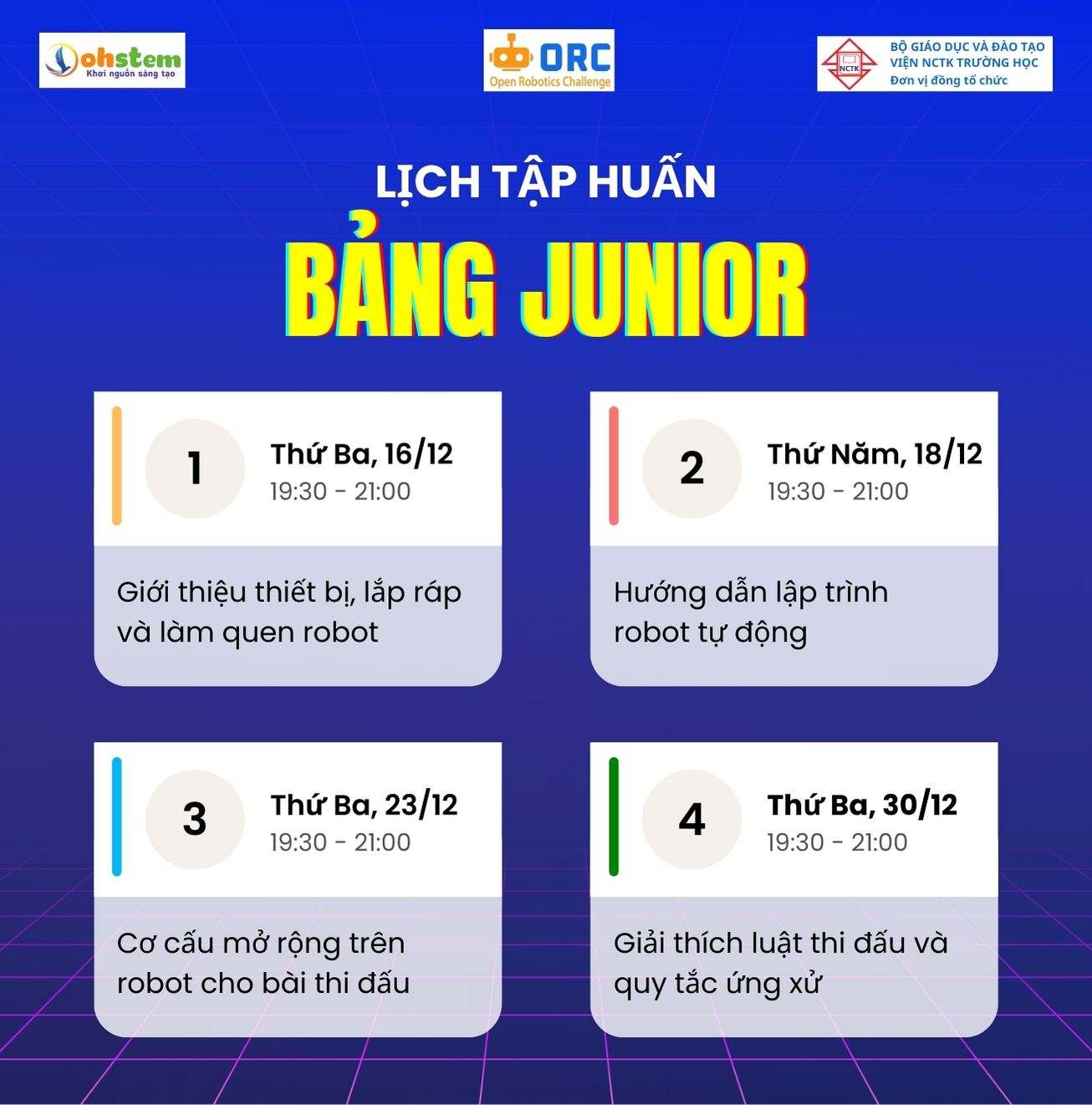 ORC Online 12/2025 sẽ đồng thời diễn ra 3 bảng thi đấu Robocon cho các cấp từ Tiểu học đến Đại học. Thầy cô và các bạn học sinh có thể chọn giải đấu phù hợp: